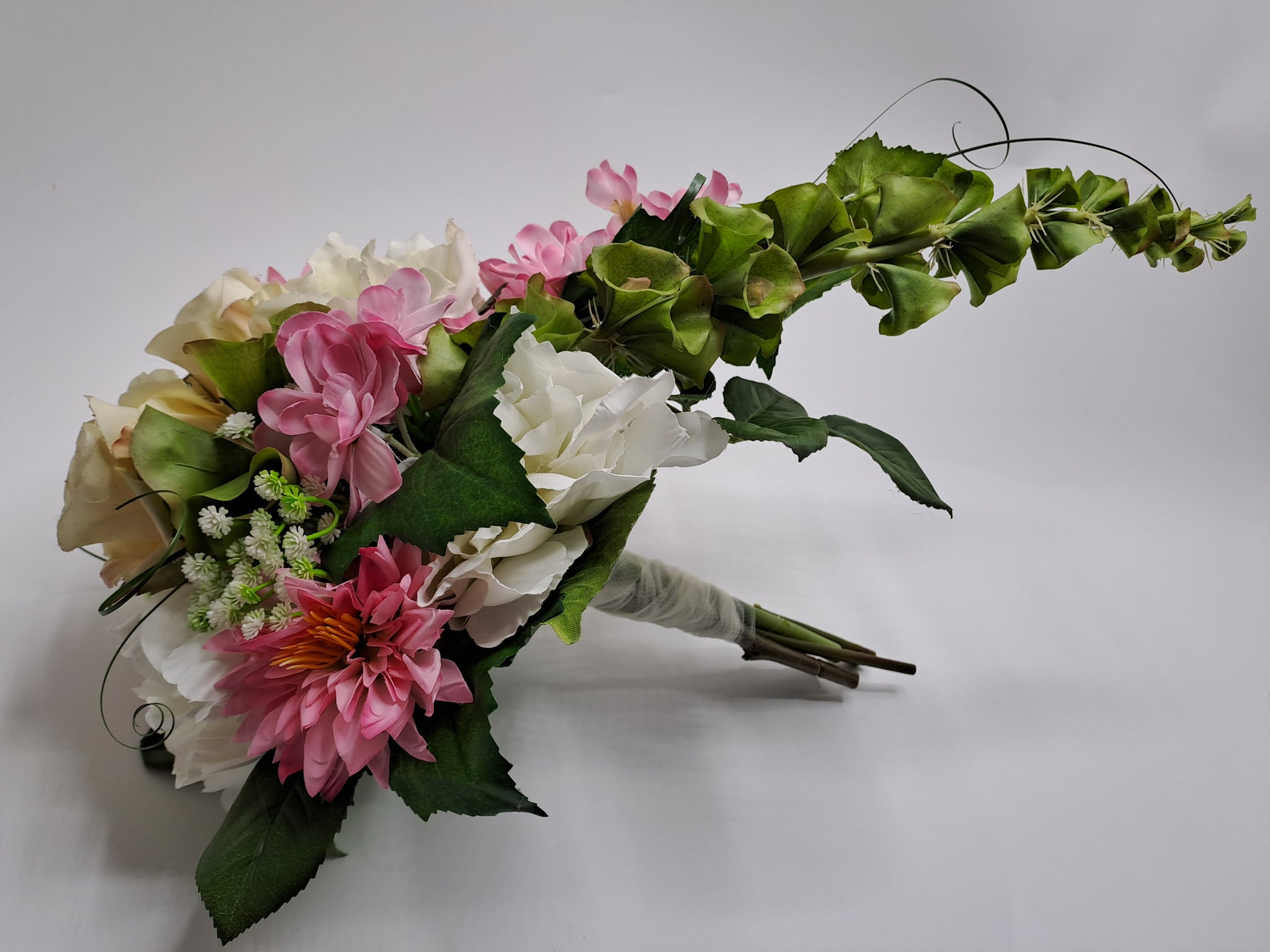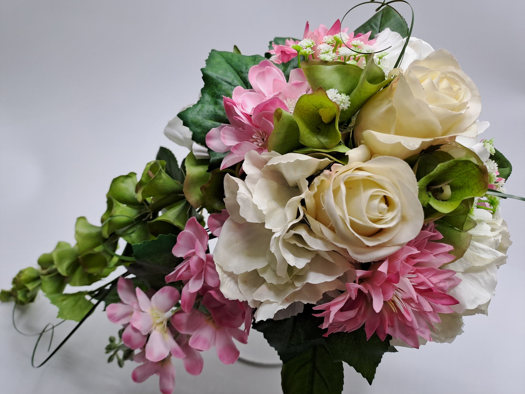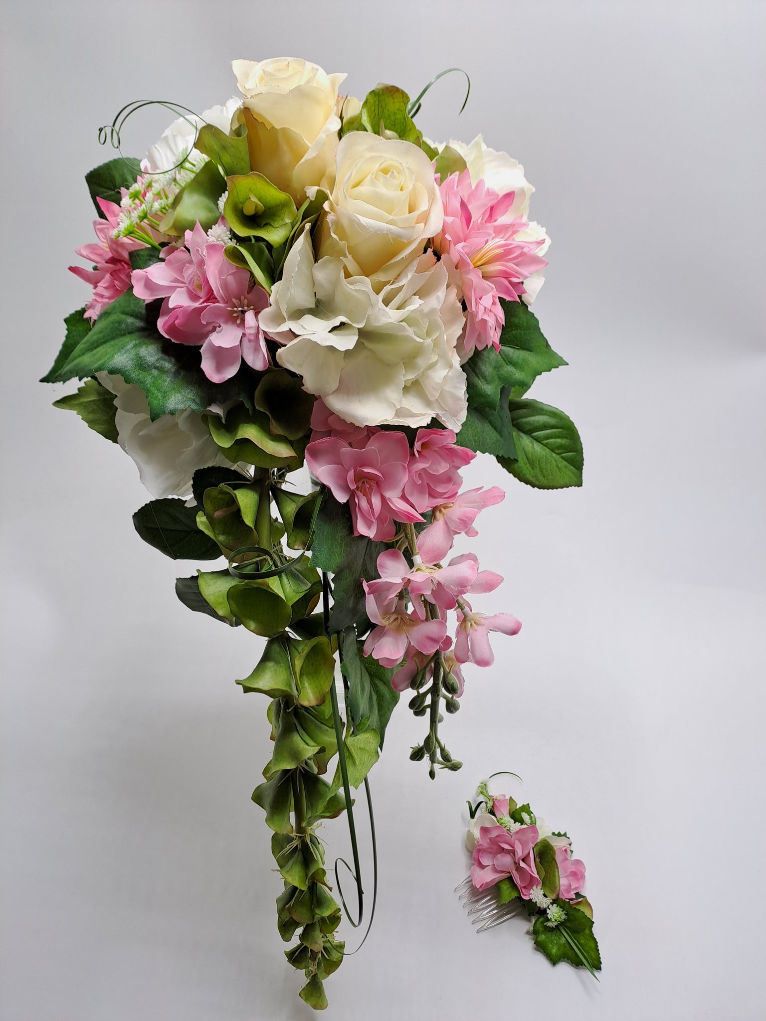 Bouquet de mariée chute, réalisé en fleurs et feuillages artificiels. Diamètre 23cm et chute de 40cm. En option la coiffure assortie, peigne fleuri à 29€