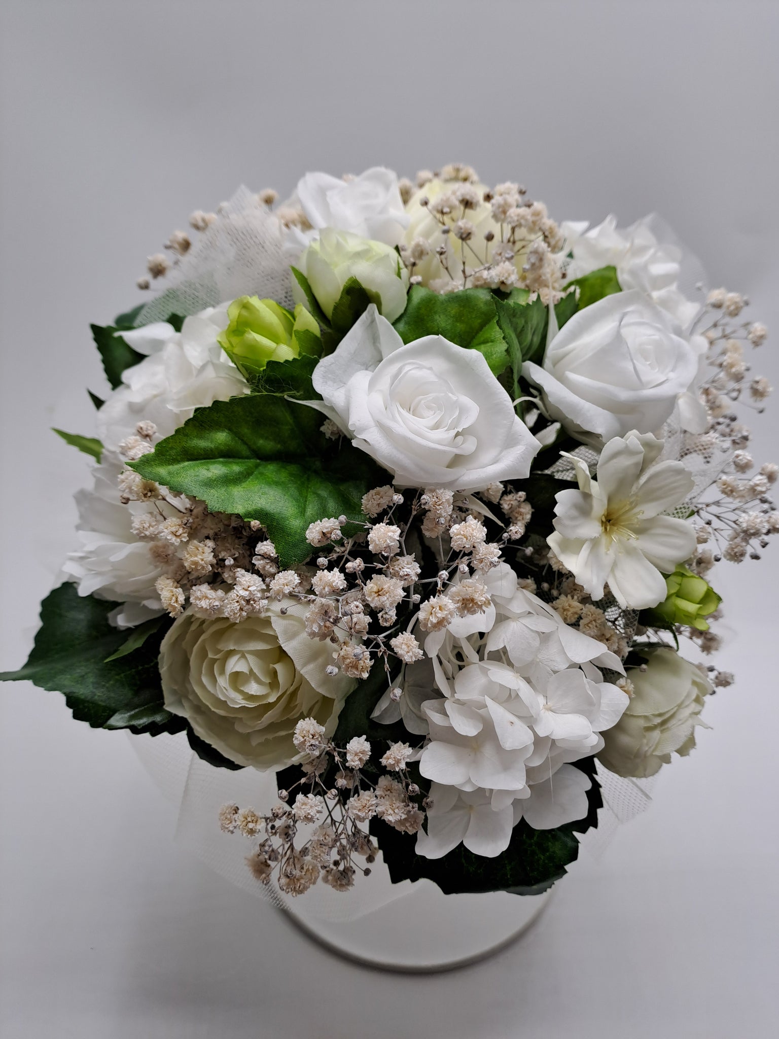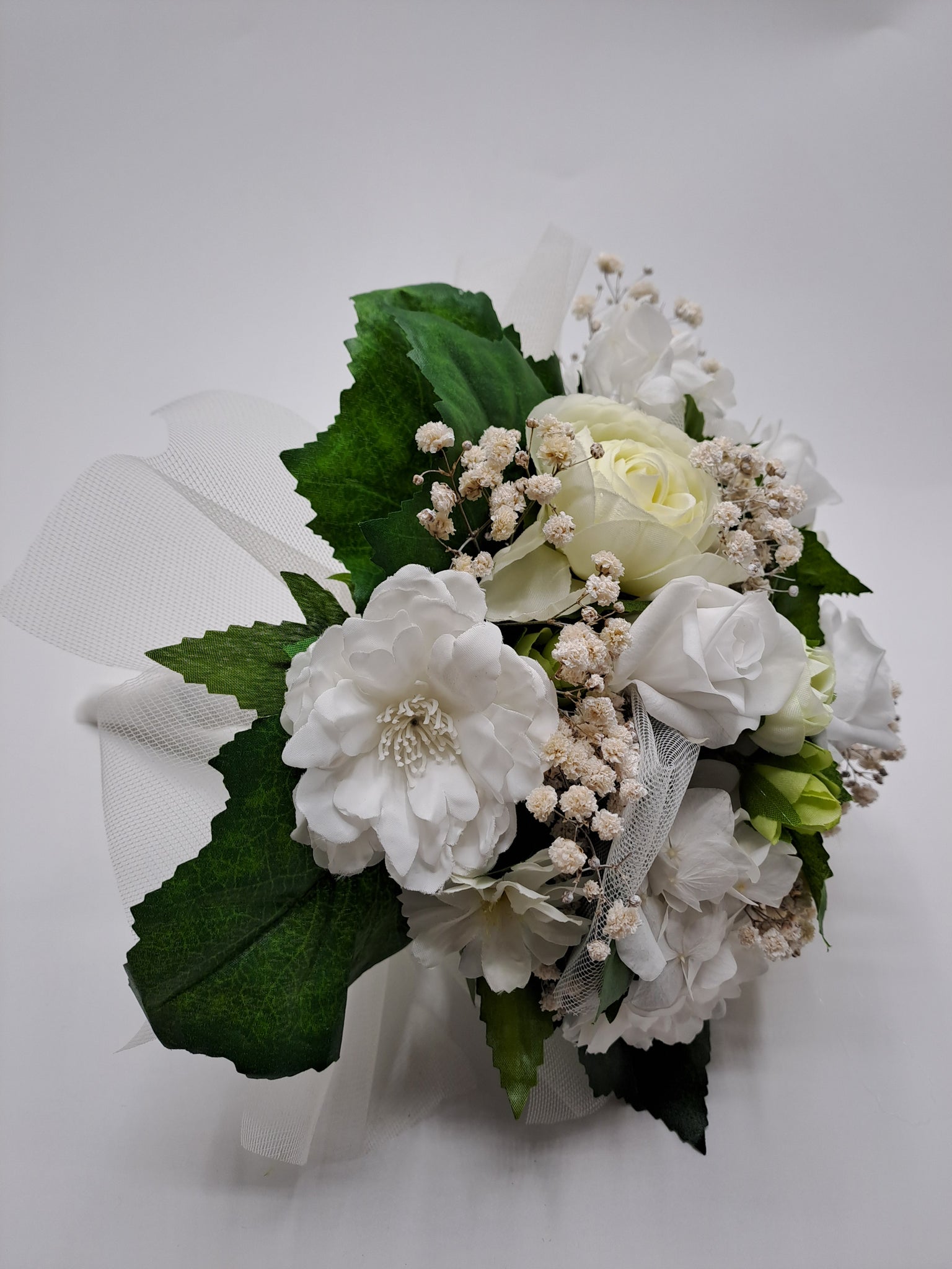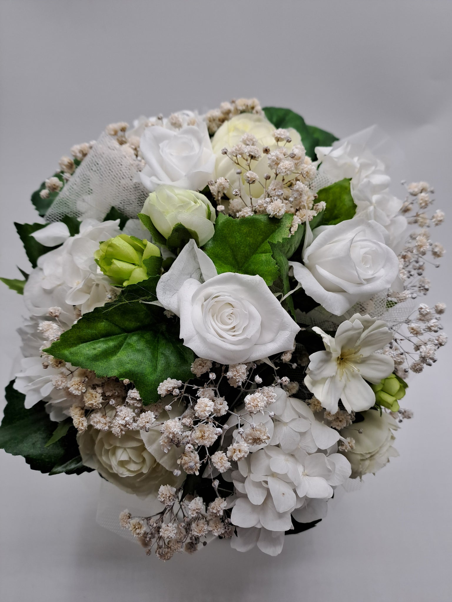 Bouquet de mariée, réalisé en fleurs naturelles stabilisées et fleurs, feuillages artificiels. Très réaliste, ce bouquet restera un très beau souvenir du jour J. Diamètre 23cm