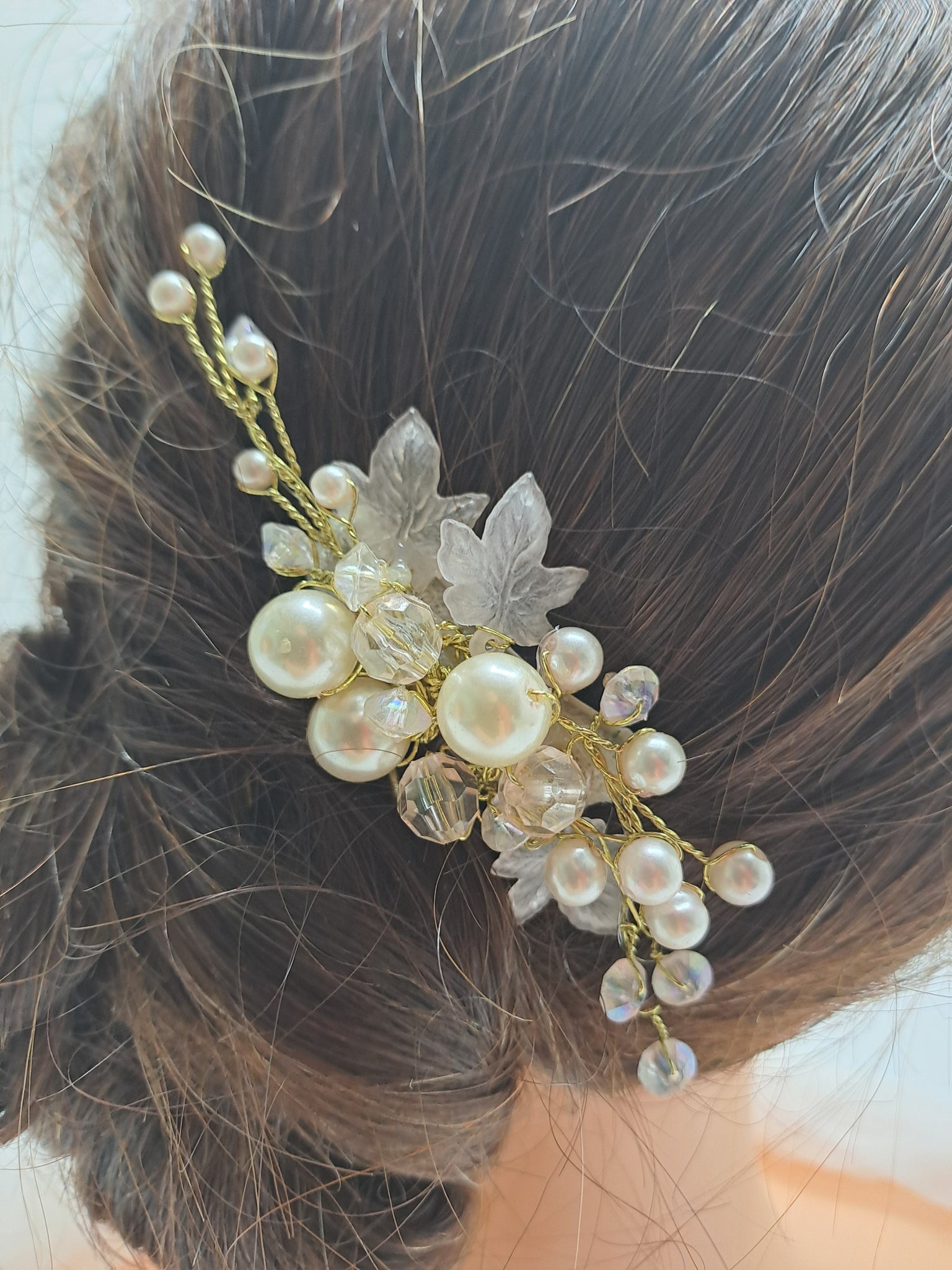 Coiffure mariée réalisée en perles nacrées roseté, perles irisées, feuilles lierre translucides, monté avec du fil doré sur un peigne transparent.