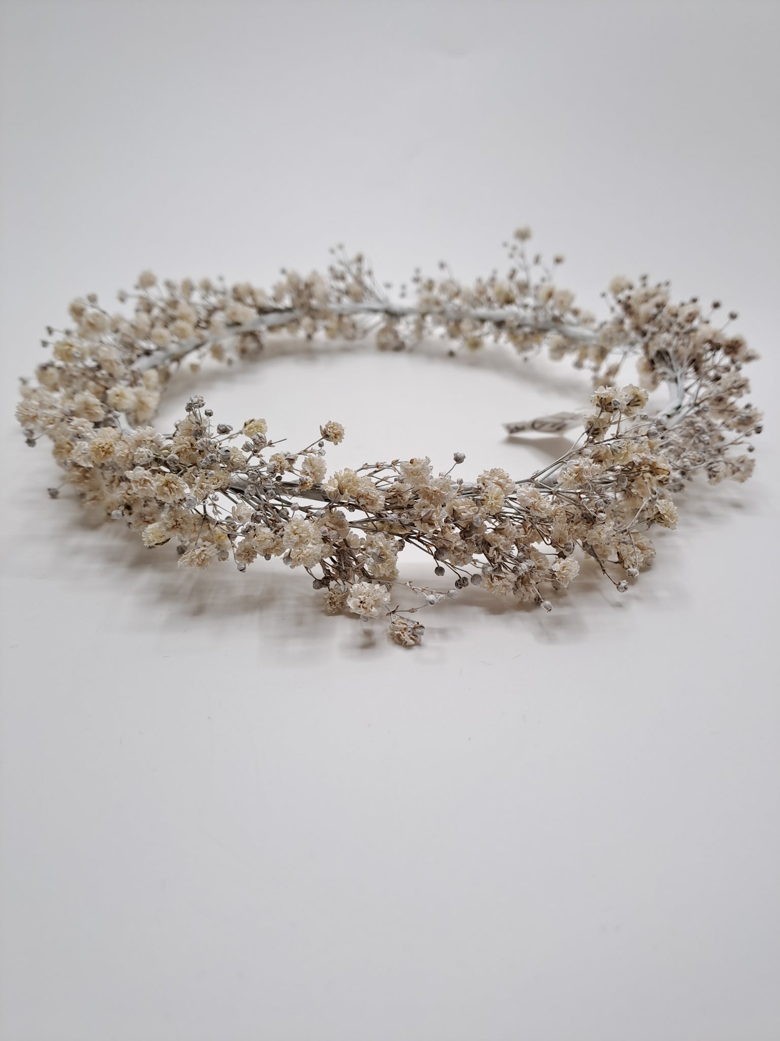 Couronne réalisée en gypsophile naturel stabilisé et blanchi. Couronne ajustable au tour de tête, 3cm d'épaisseur.