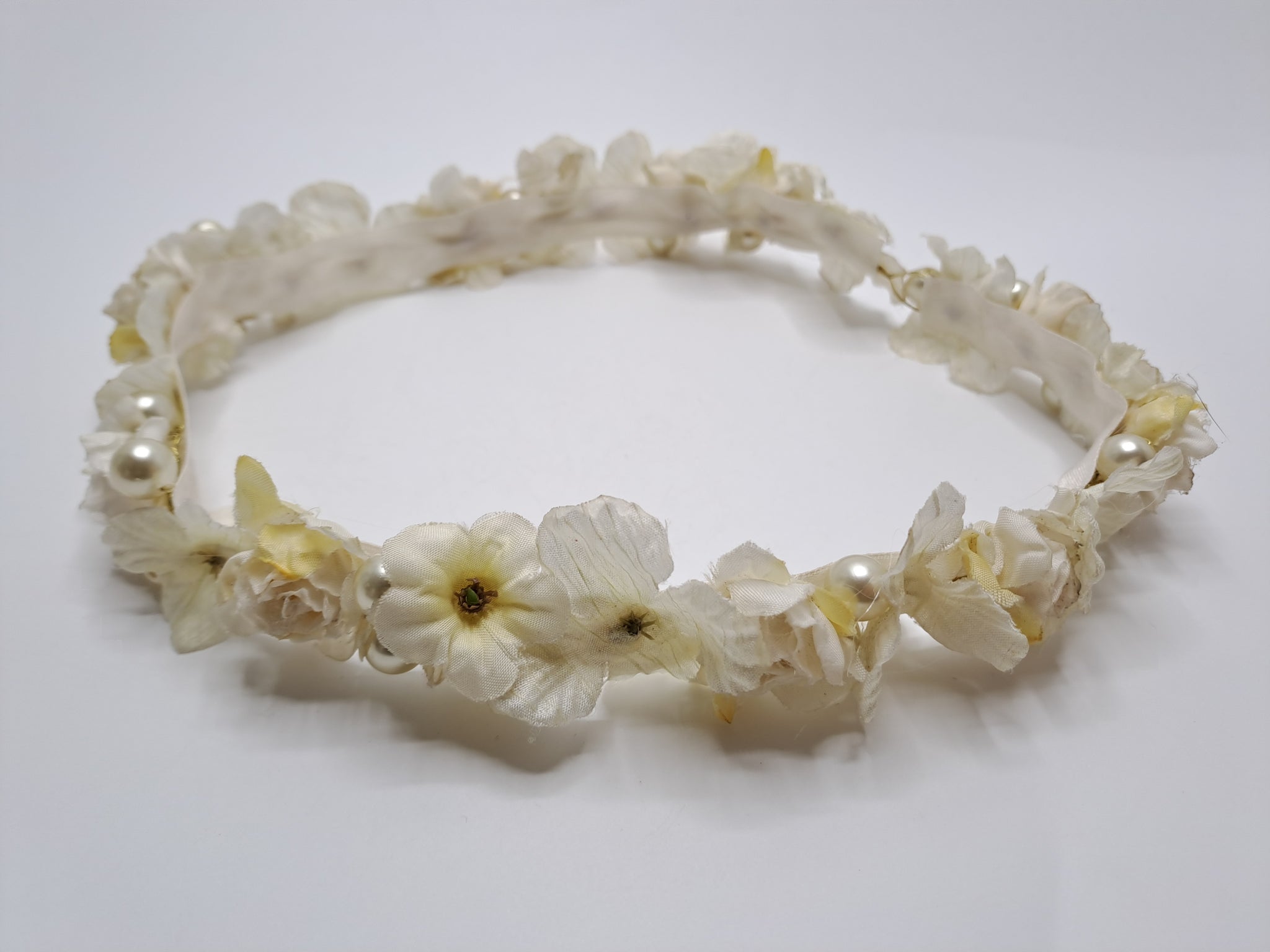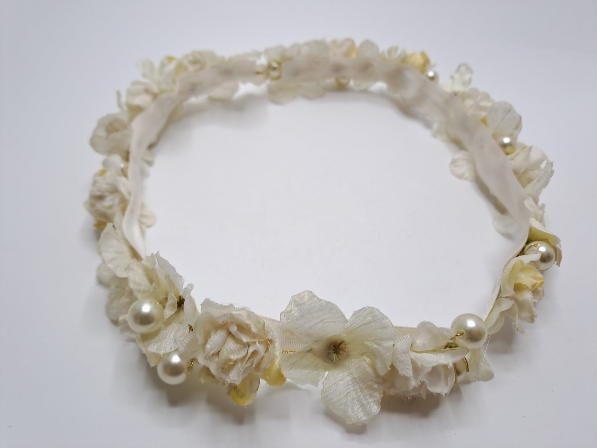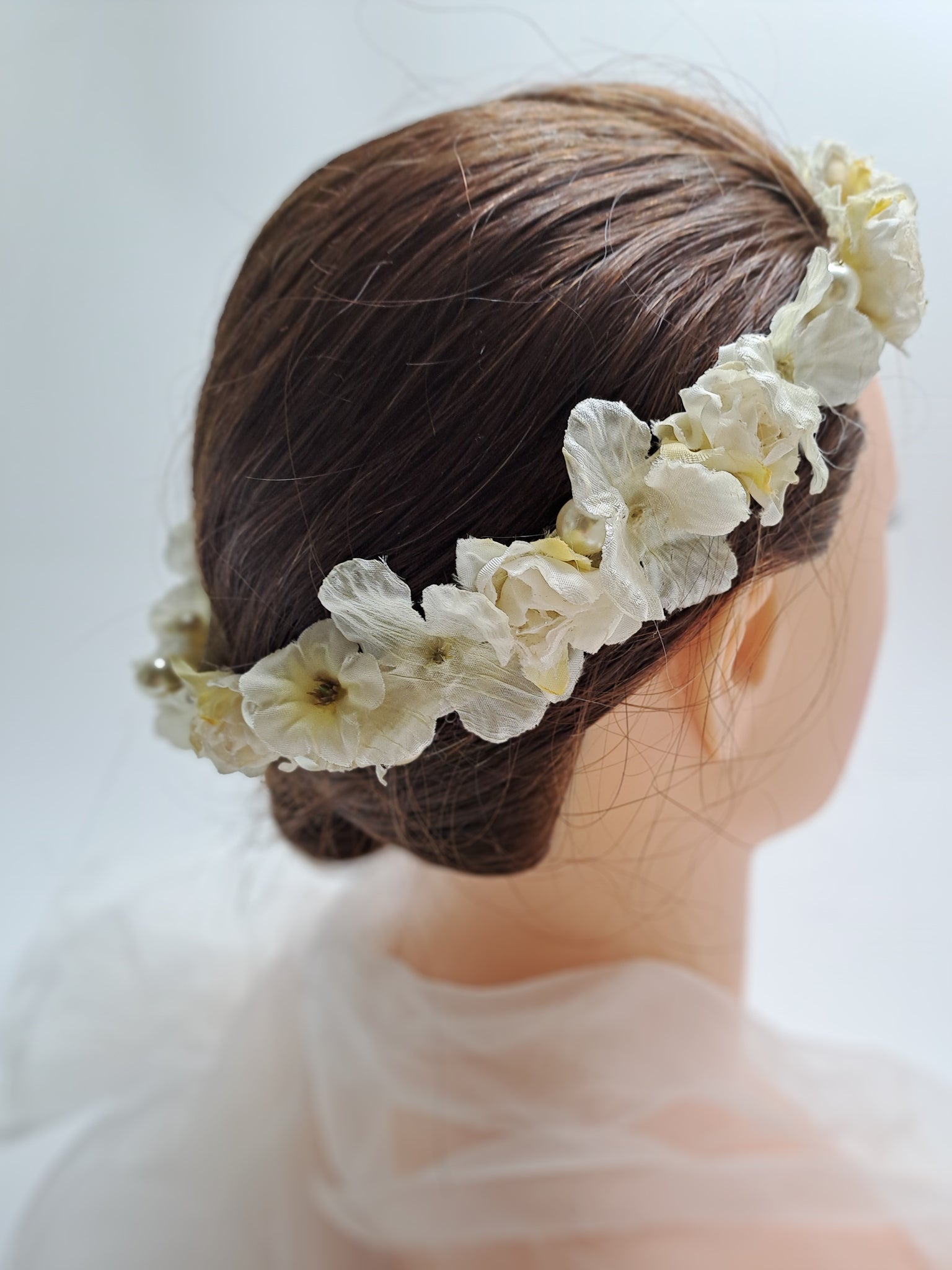 Couronne de mariée, réalisée en fleurs d'hortensia de soie et roses, fleurettes tissu, perles nacrées. Tour de tête 55cm, me demander si vous voulez plus long ou court..