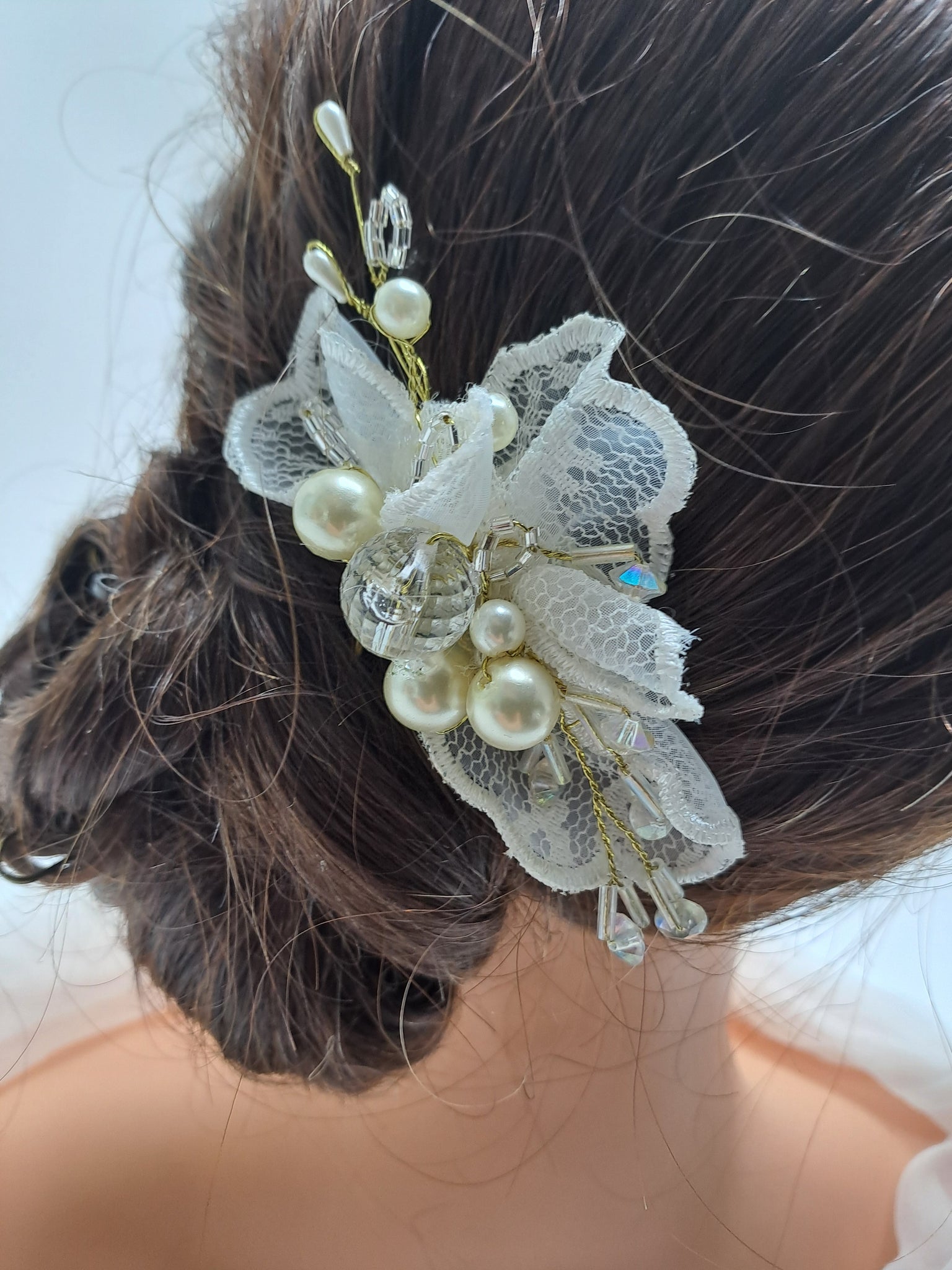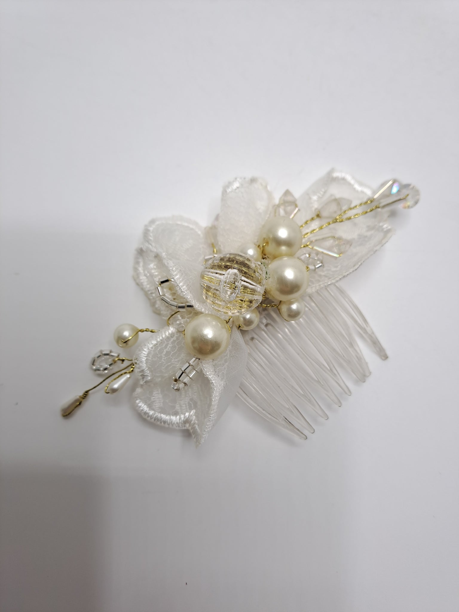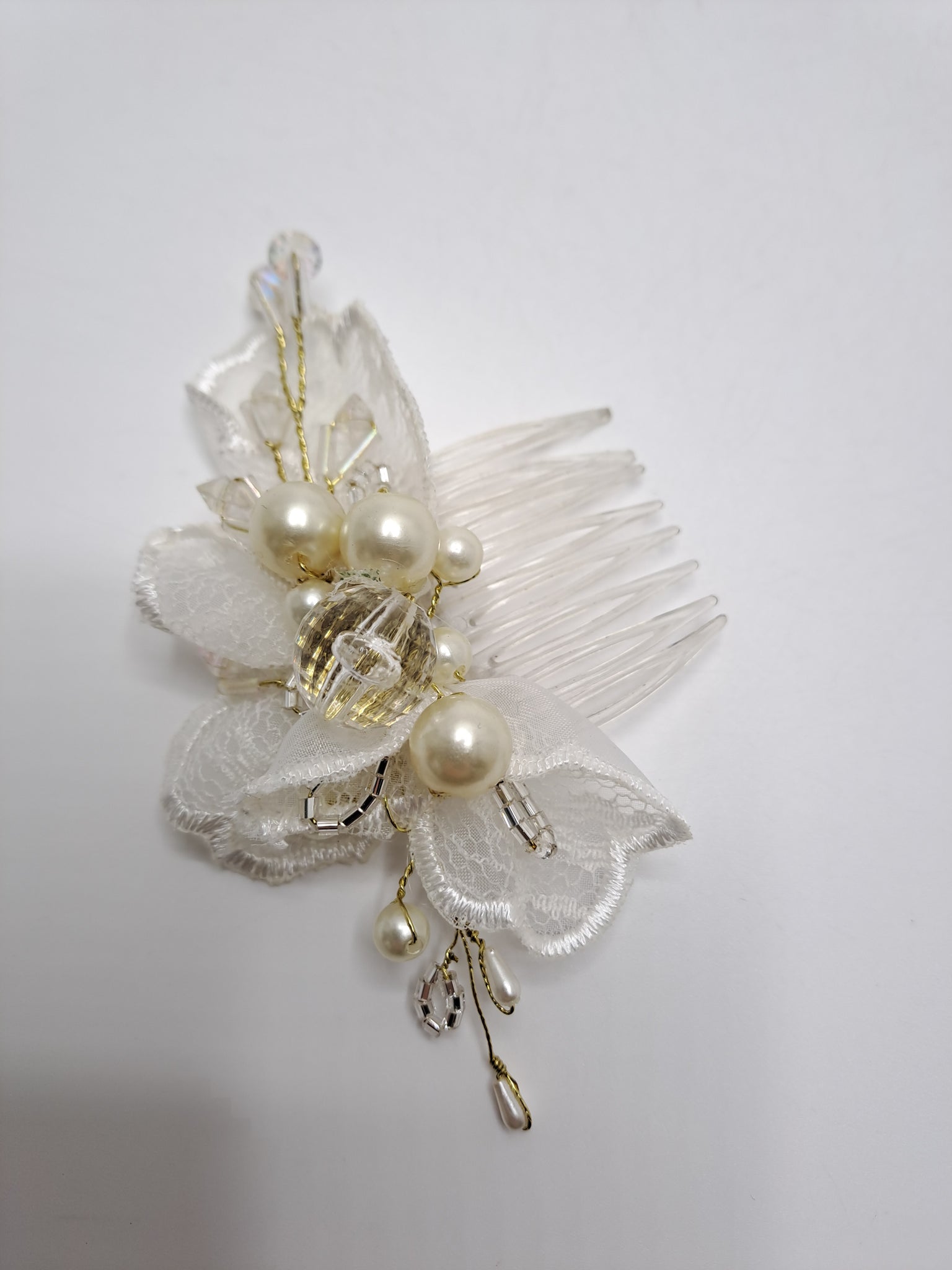Peigne mariée, réalisé en perles nacrées, transparentes, irisées, argentées et dentelle. Longueur 10cm par 3cm