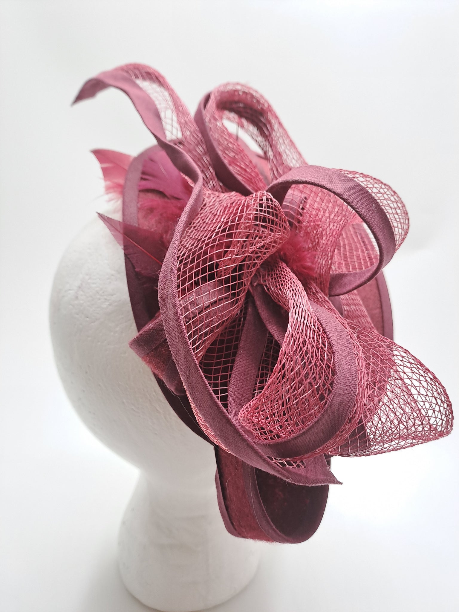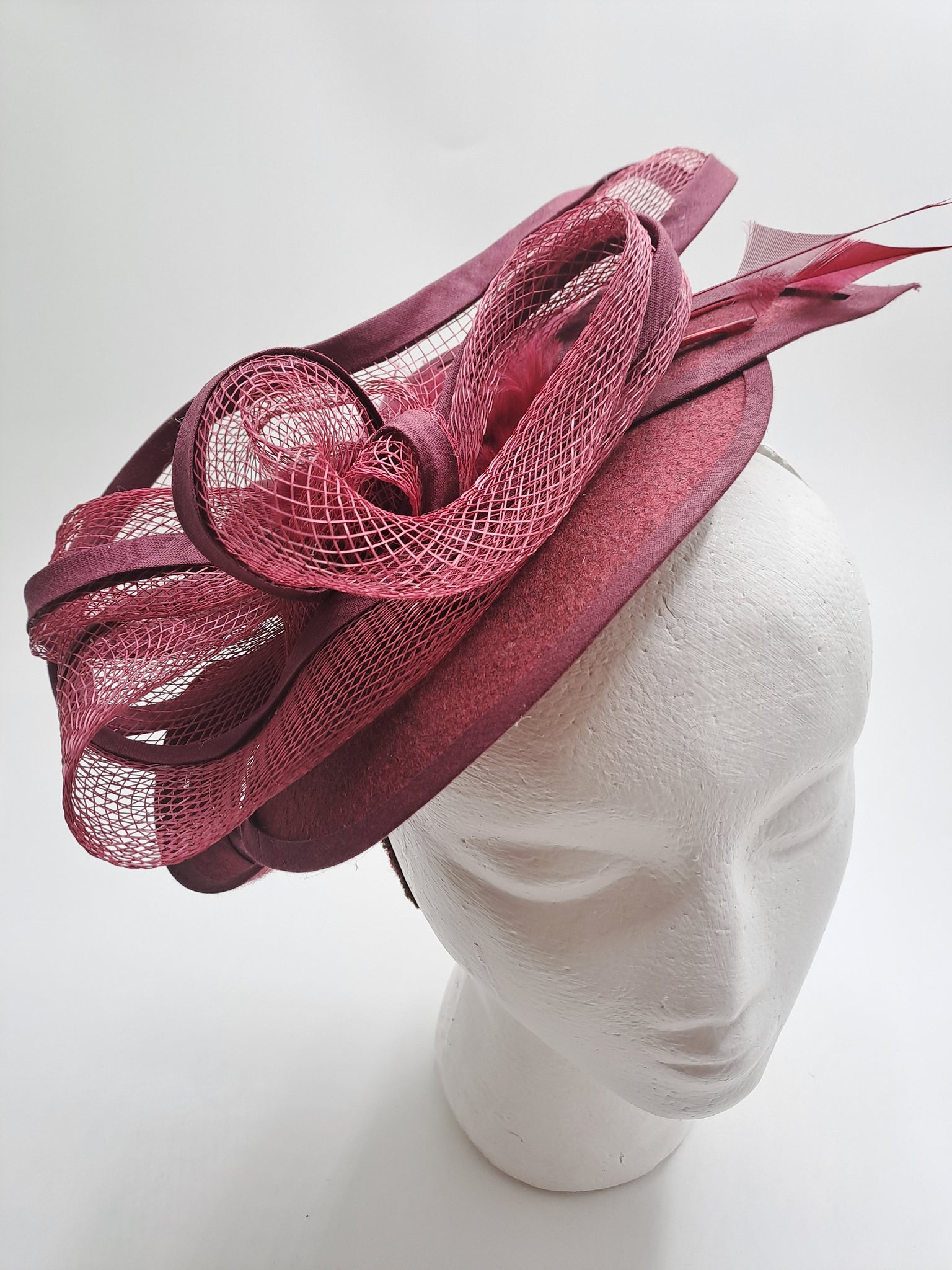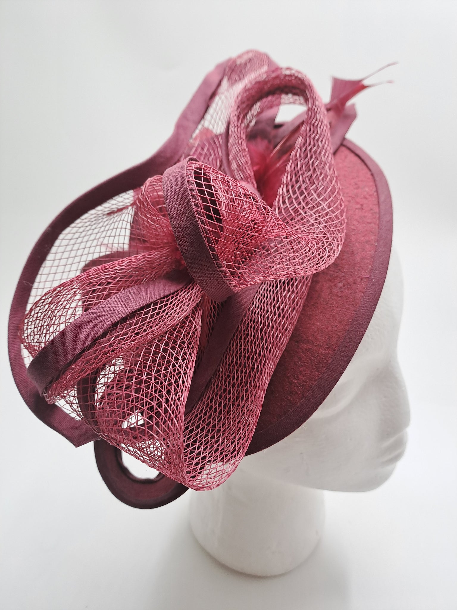 Bibi dégradé bordeaux, réalisé en feutre, crin,biais, plumes marabous. Monté sur un serre-tête réglable à la forme de votre tête, confortable et invisible entre vos cheveux. Largeur 26cm et 13cm de profondeur..