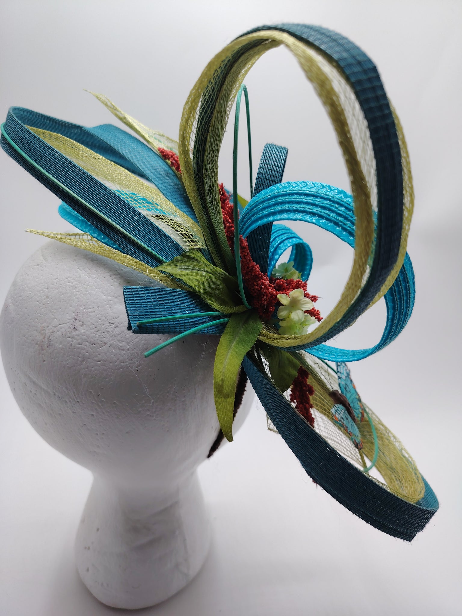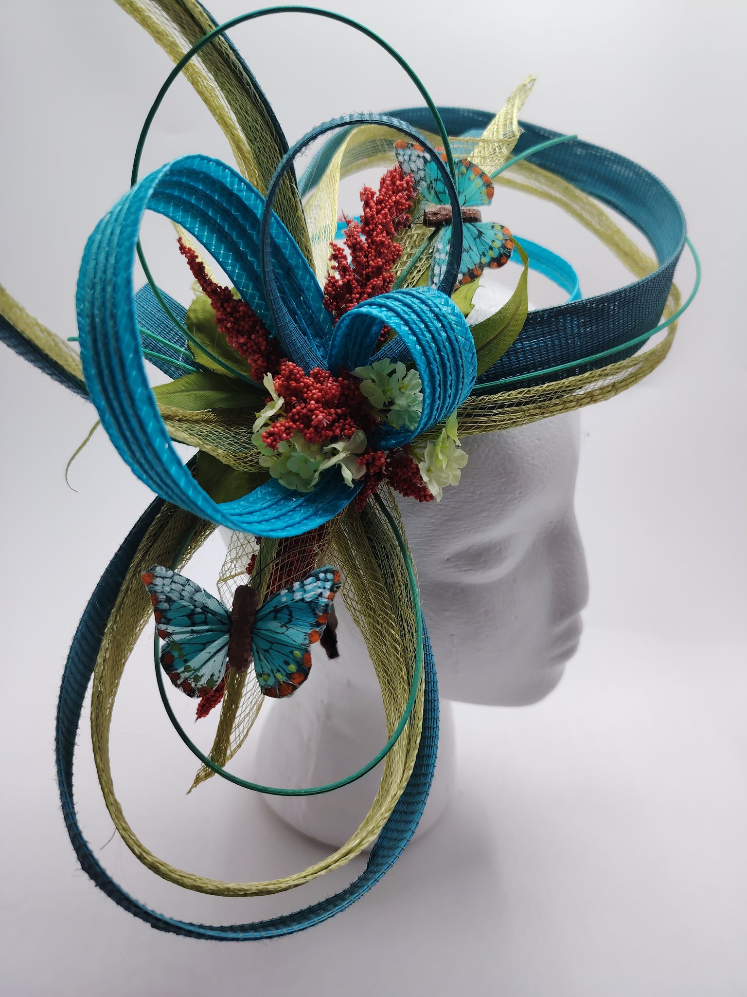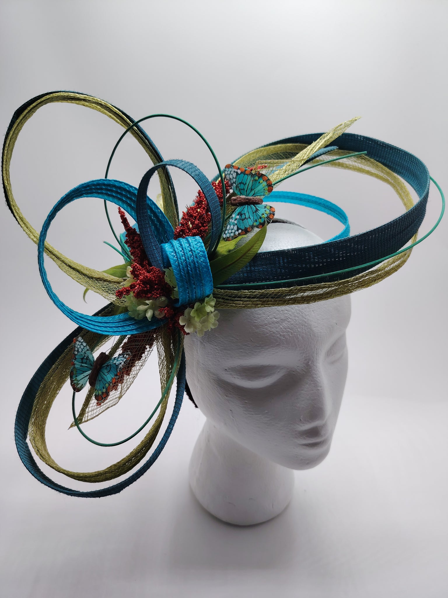 Facinator stylisé réalisé en paille, buntal,sisal, papillons, fleurs, baies, joncs... Monté sur un serre-tête réglable à la forme de votre tête, confortable et invisible entre vos cheveux. Dimensions 34cm de large, 18cm profondeur et 16cm de haut