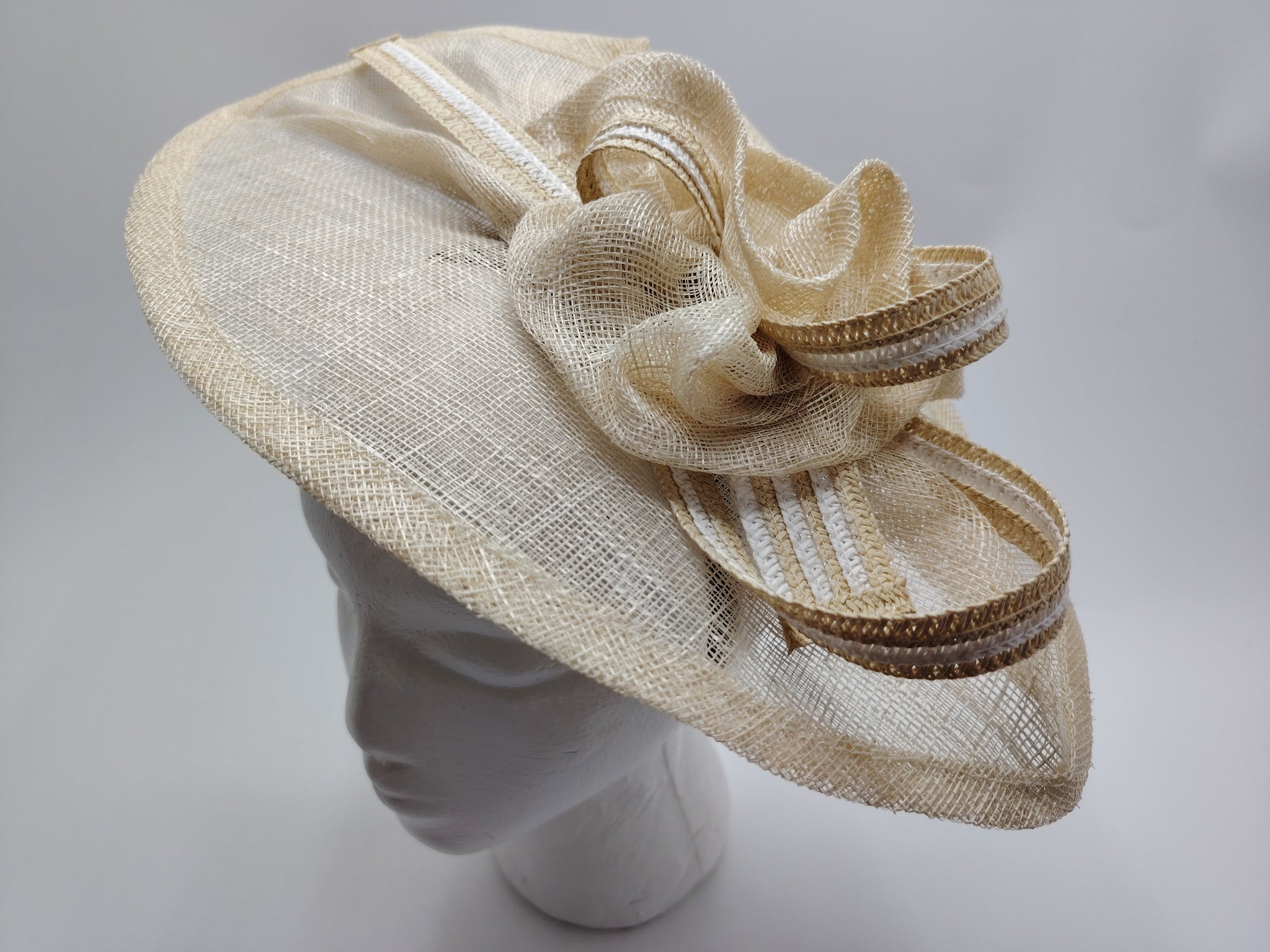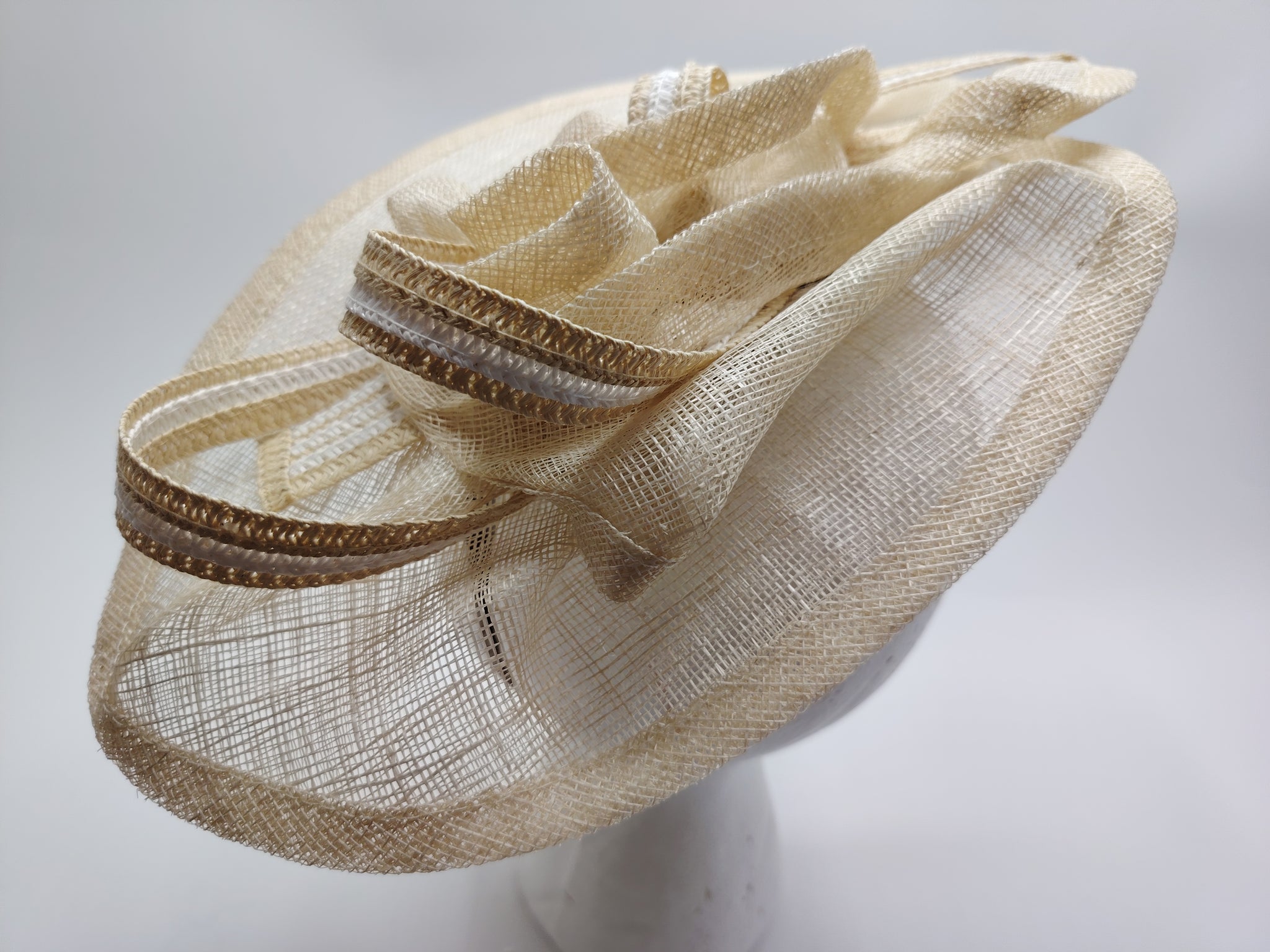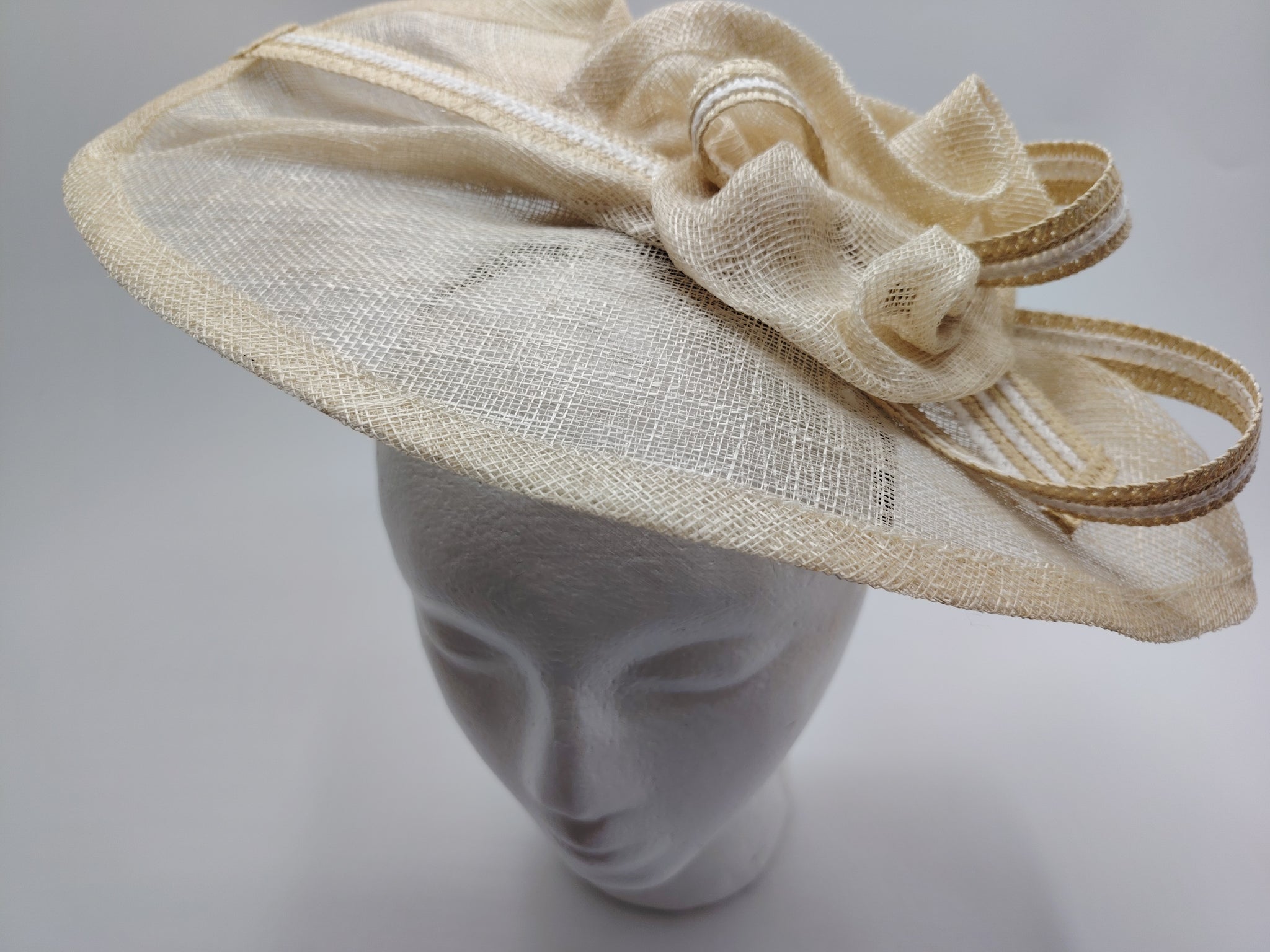 Facinator réalisé en abaca et paille blanc ivoire. Monté sur un serre-tête réglable à la forme de votre tête, confortable et invisible entre vos cheveux. Dimensions 34cm de large et 21cm de profondeur