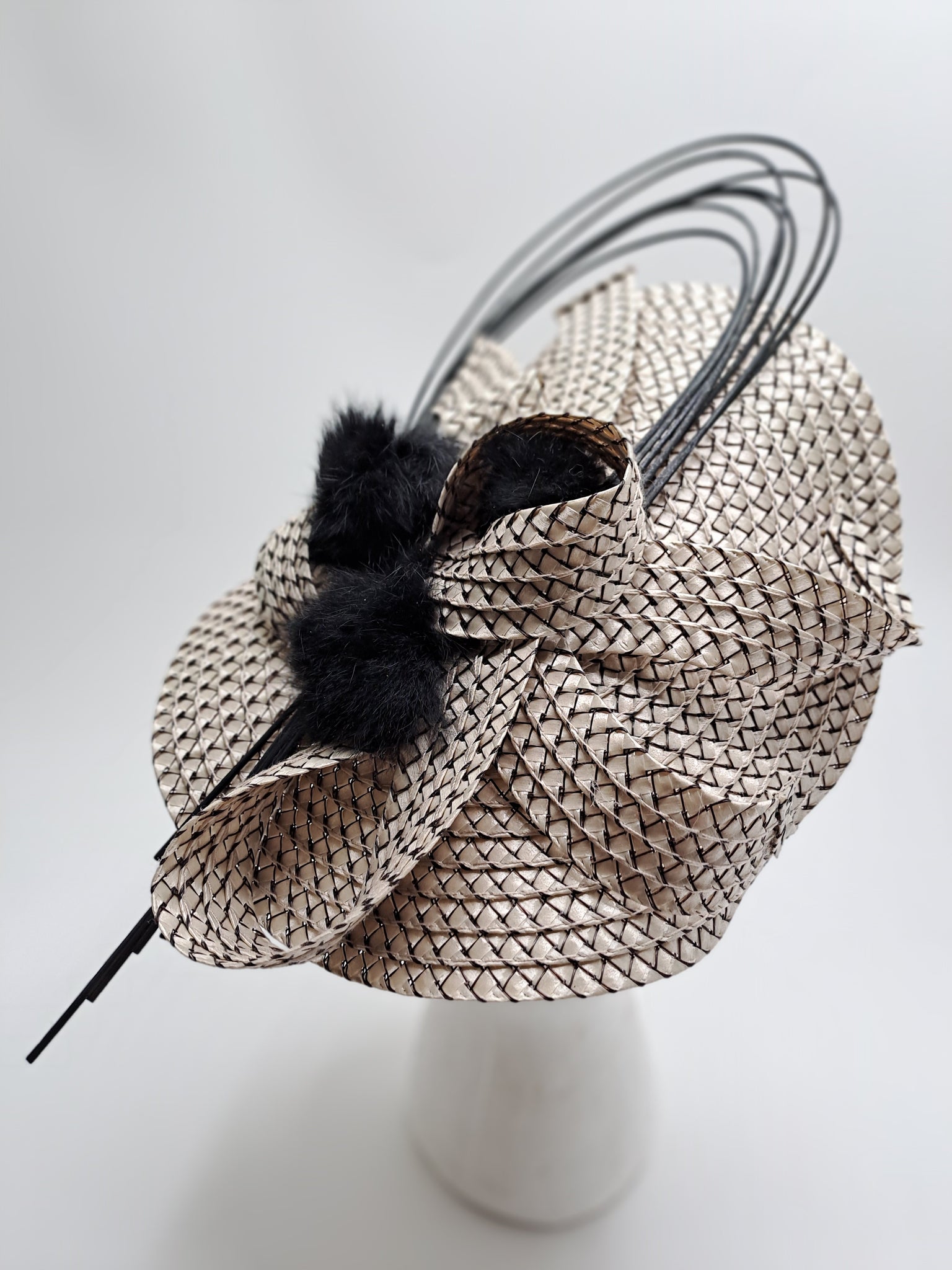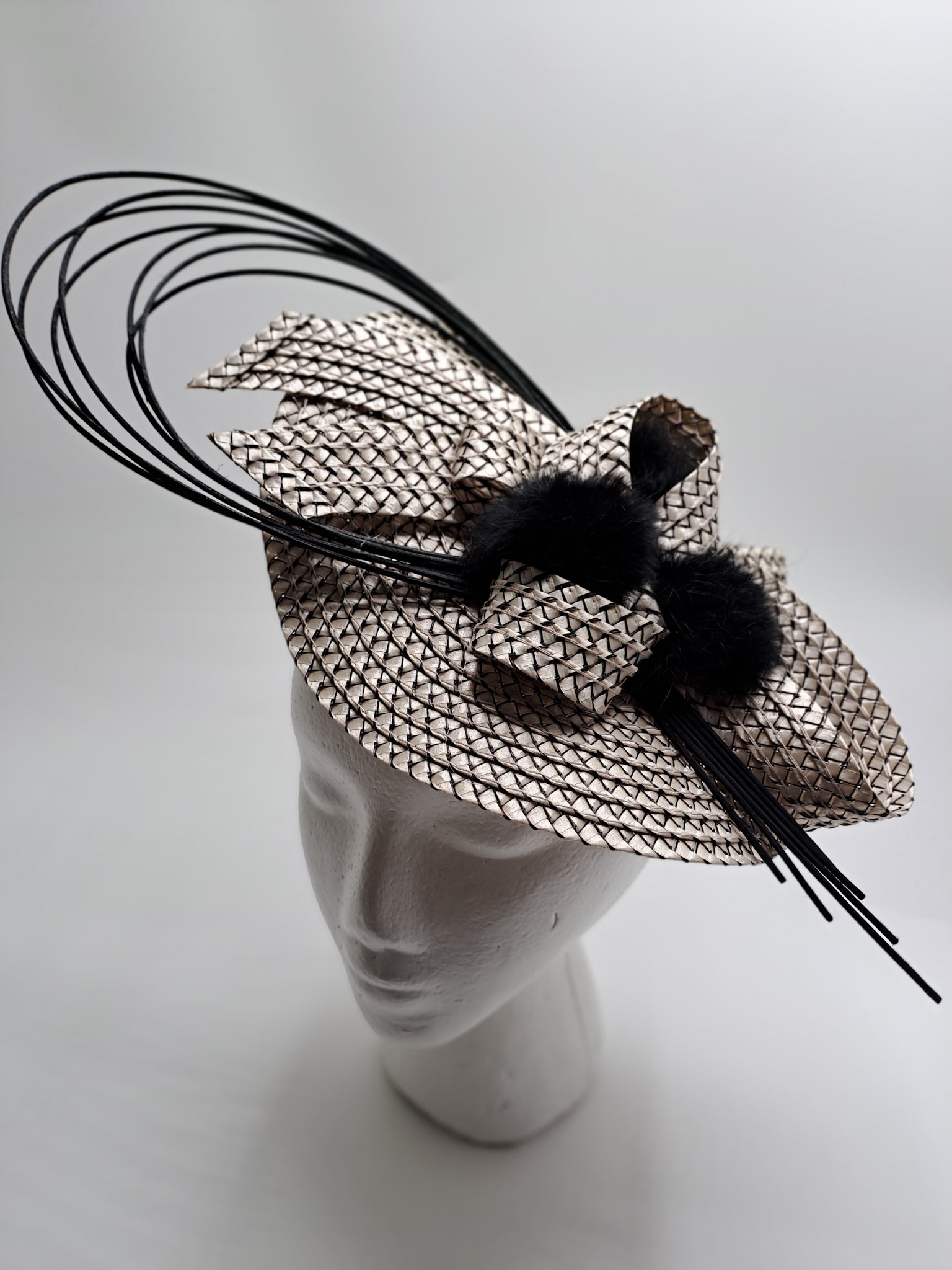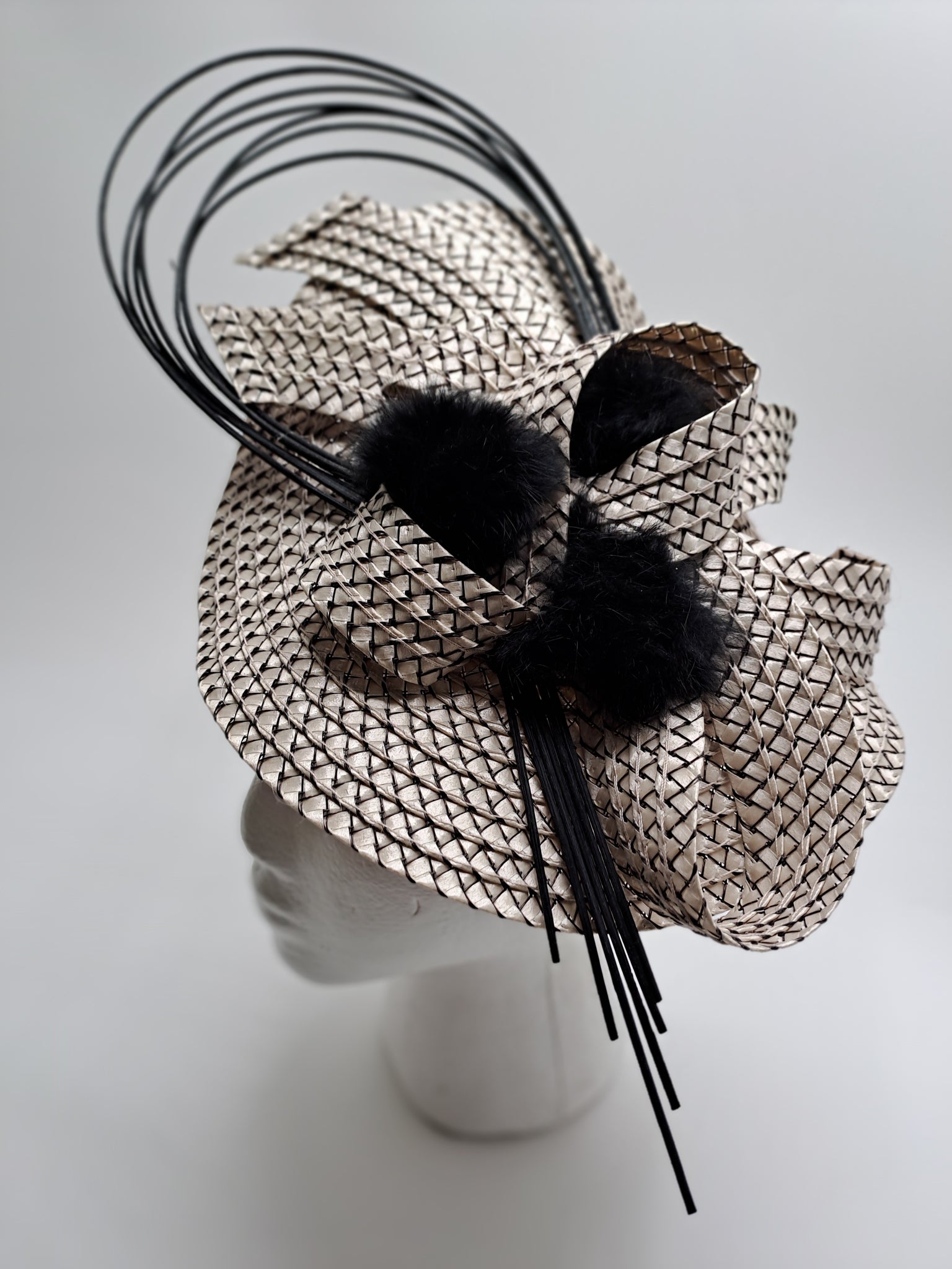 Facinator bicolore, réalisé en paille ivoire nacré et noir, joncs et pompons lapin naturel. Largeur 39cm, profondeur 23cm. Monté sur un serre-tête réglable à la forme de votre tête, confortable et invisible entre vos cheveux
