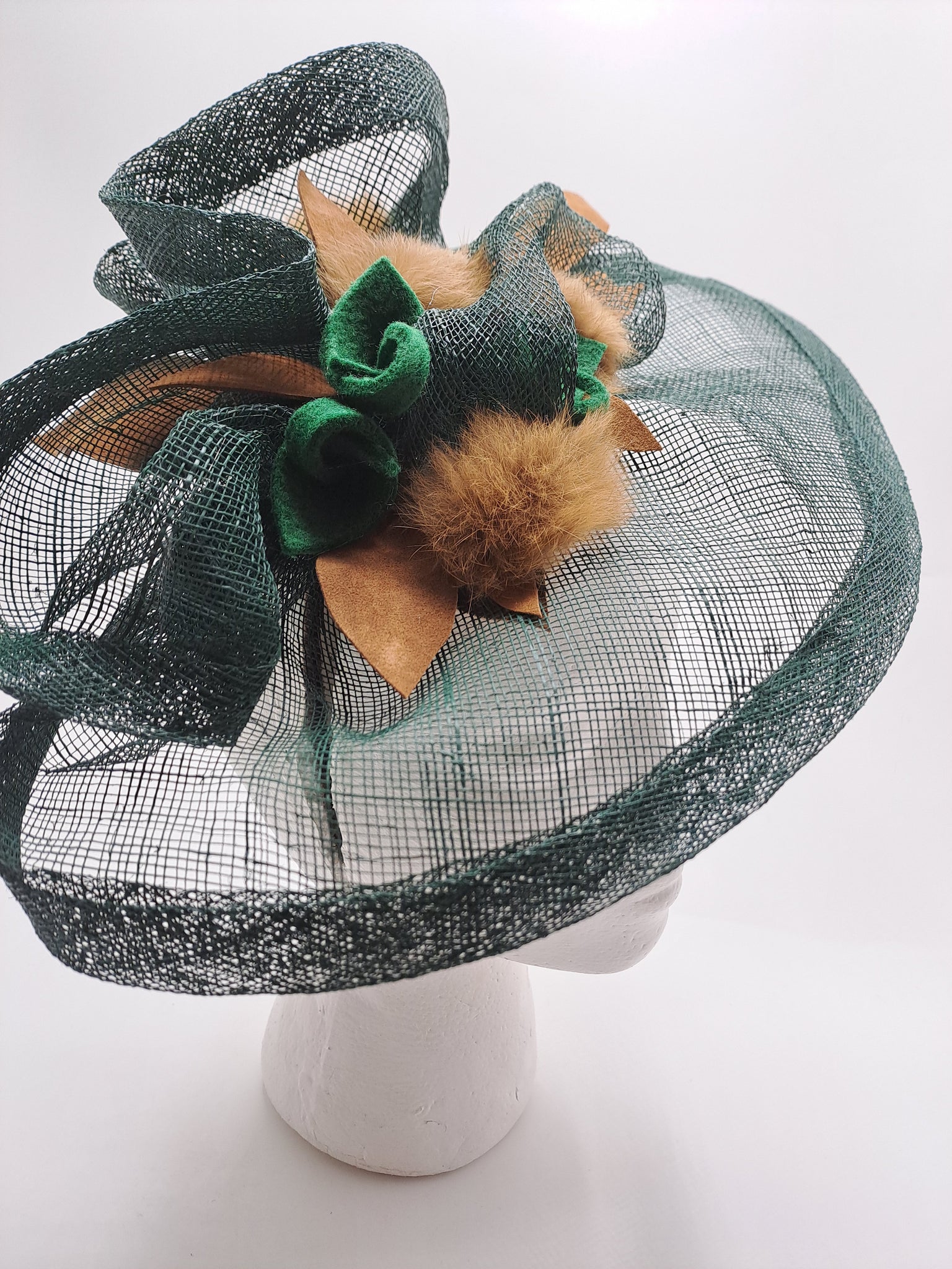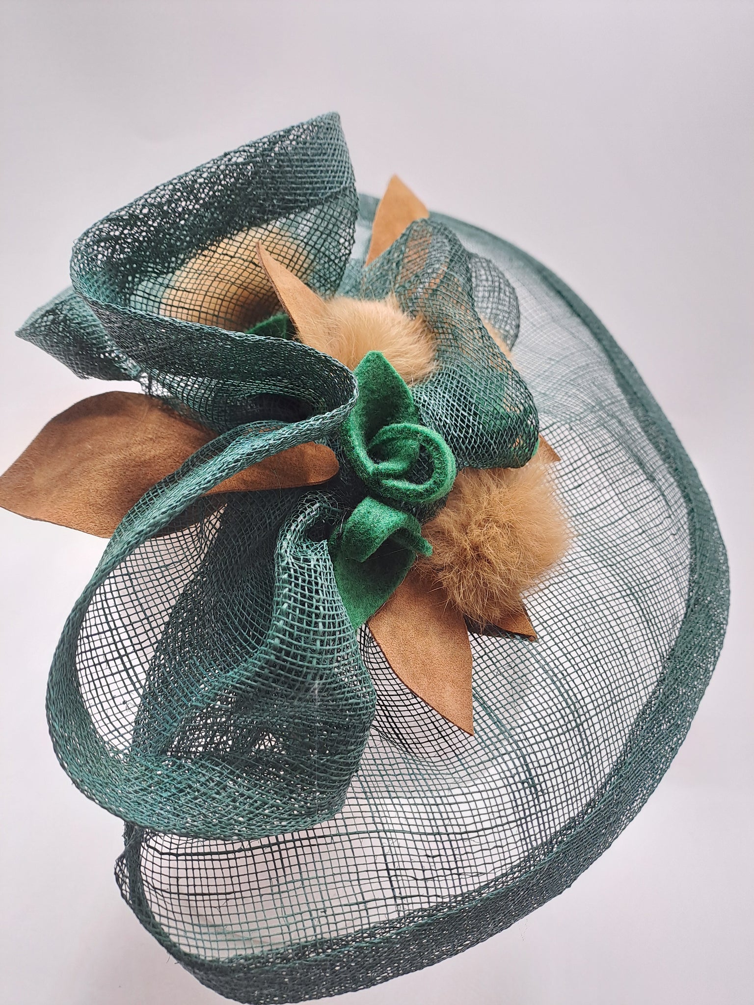 Facinator réalisé en abaca et feutre vert avec des touches de dain et fourrure lapin caramel. Monté sur un serre-tête réglable à la forme de votre tête, confortable et invisible entre vos cheveux. Largeur 34cm et 23cm de profondeur