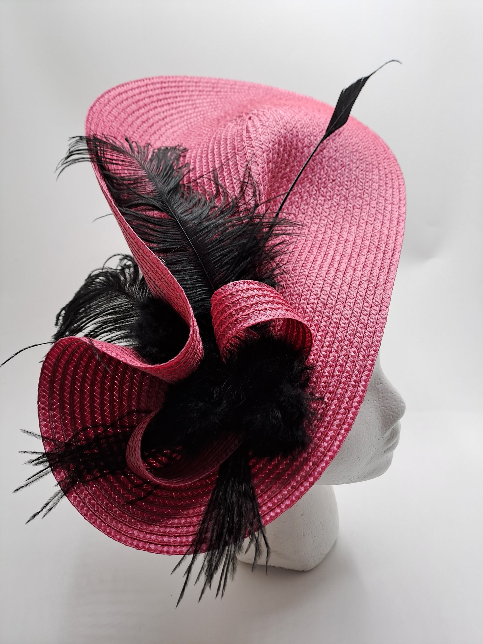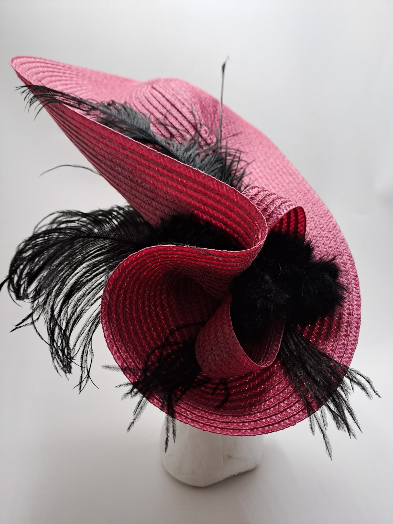Facinator réalisé en paille rose fushia, plumes d'autruche et marabou, boucles fourrures lapin. Monté sur un serre-tête réglable à la forme de votre tête, confortable et invisible entre vos cheveux. Largeur 38cm et 24cm de profondeur.