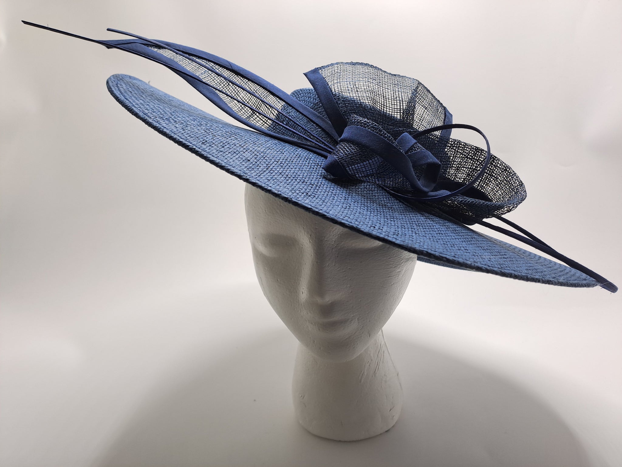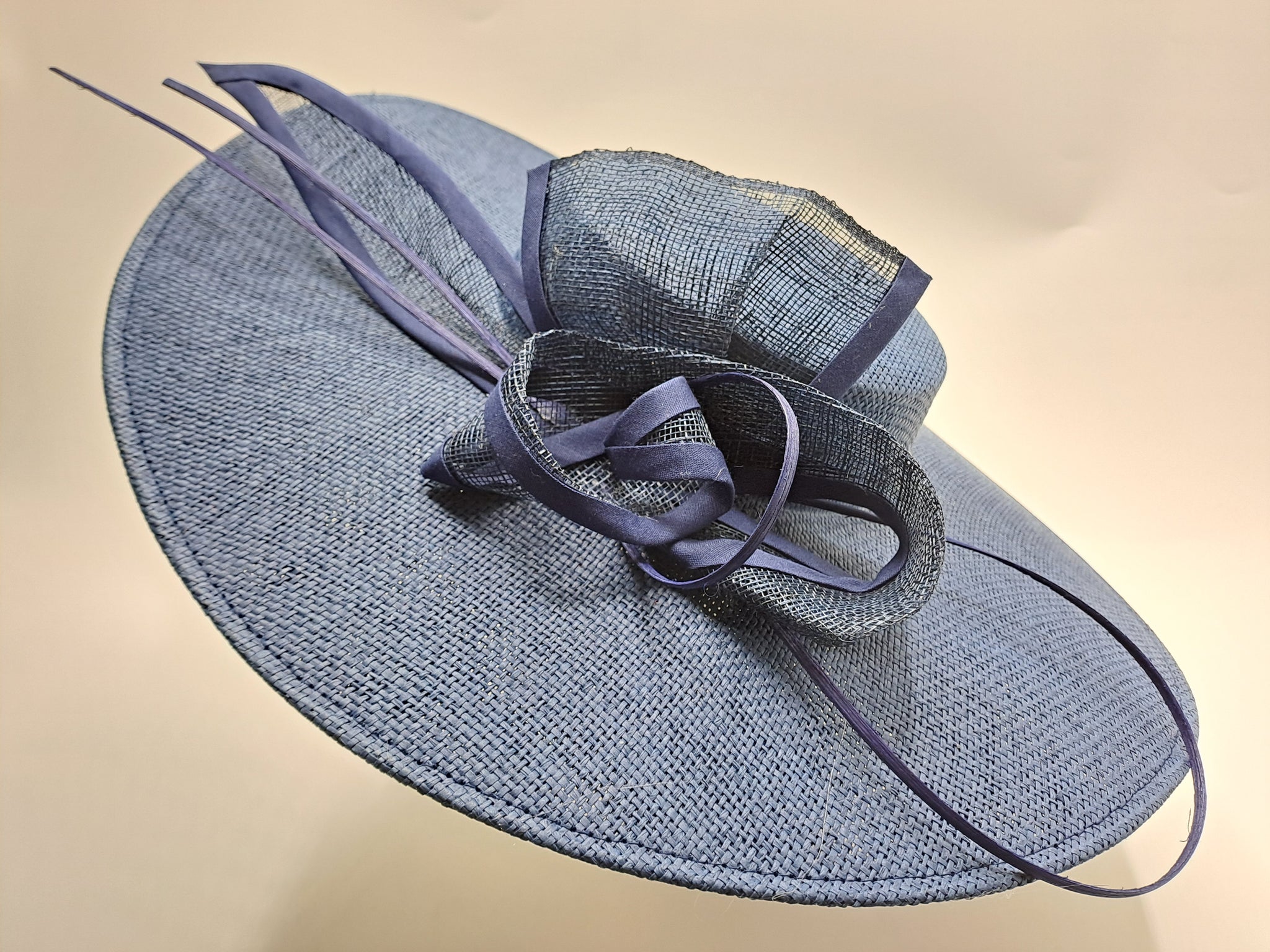 Capeline stylisée bleu marine, calotte droite 4,5cm, motif stylisé en joncs, biais et abaca. Largeur 44cm, diamètre 40cm