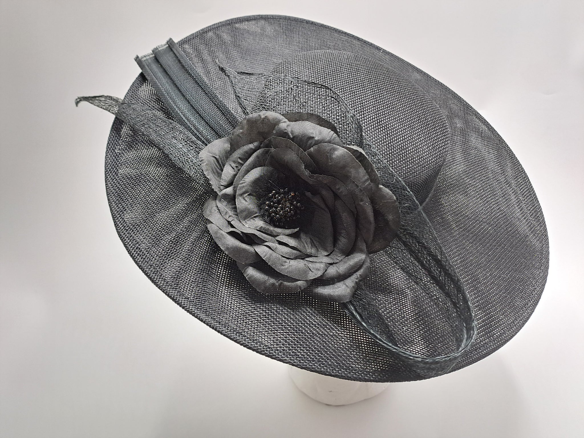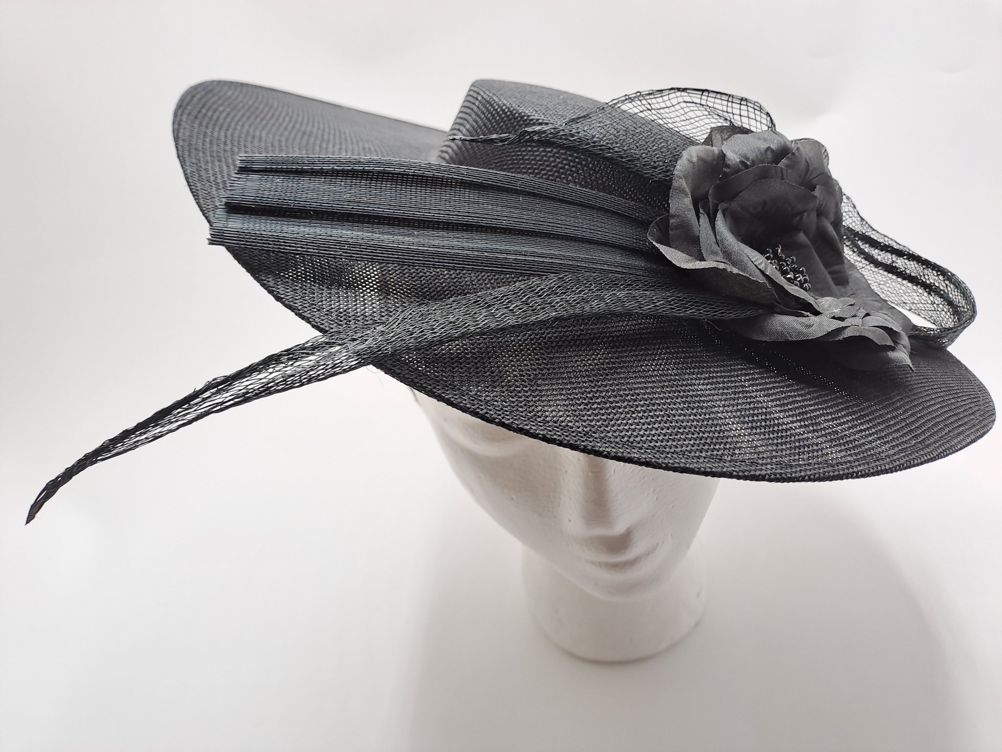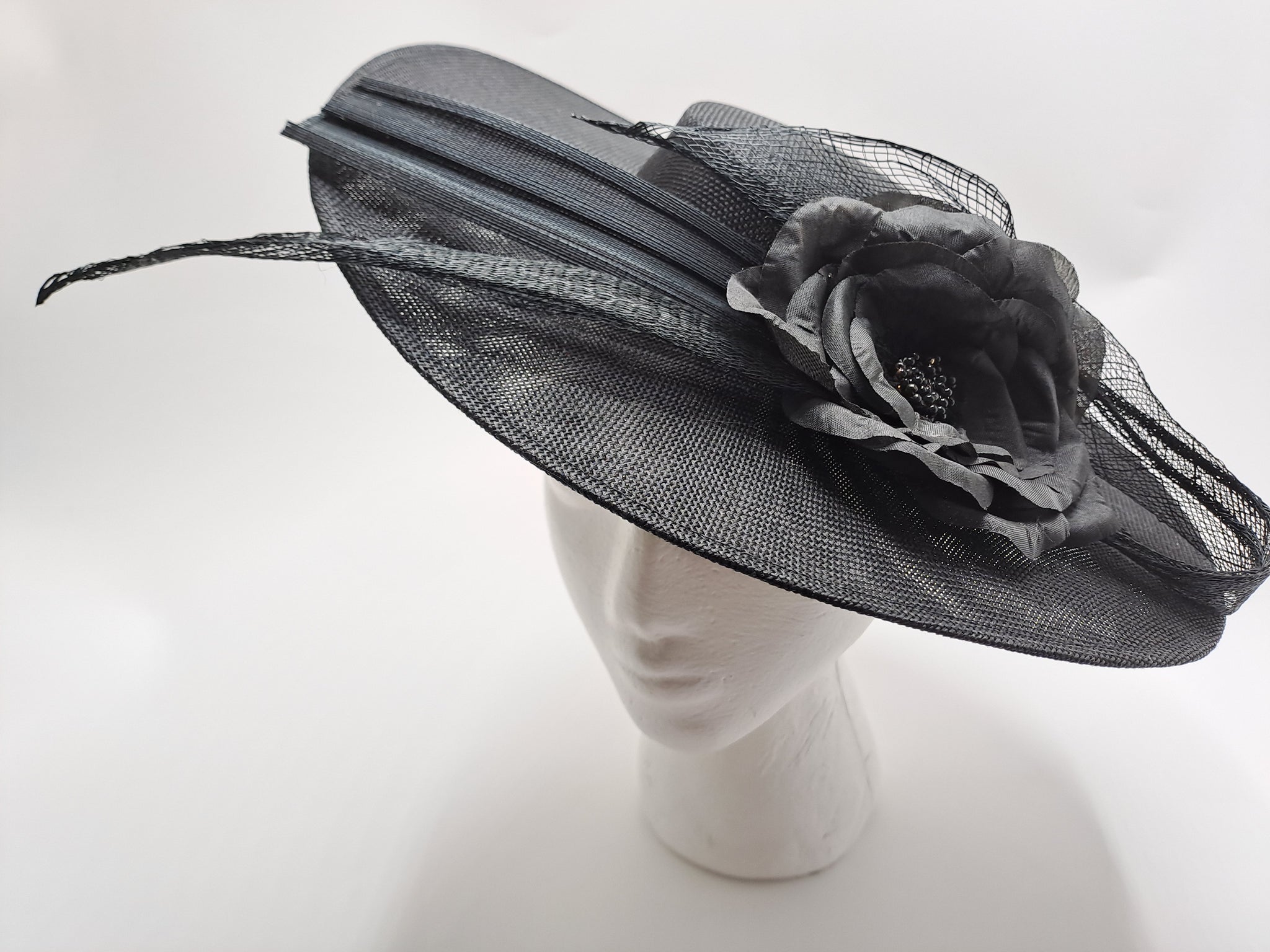 Petite capeline noire, motif en sisal, buntal et de fleur de camélia. Montée sur un serre-tête réglable à la forme de votre tête, confortable et invisible entre vos cheveux, n' hésitez pas à consulter le tutoriel. Dimensions 36cm de large diamètre 33cm