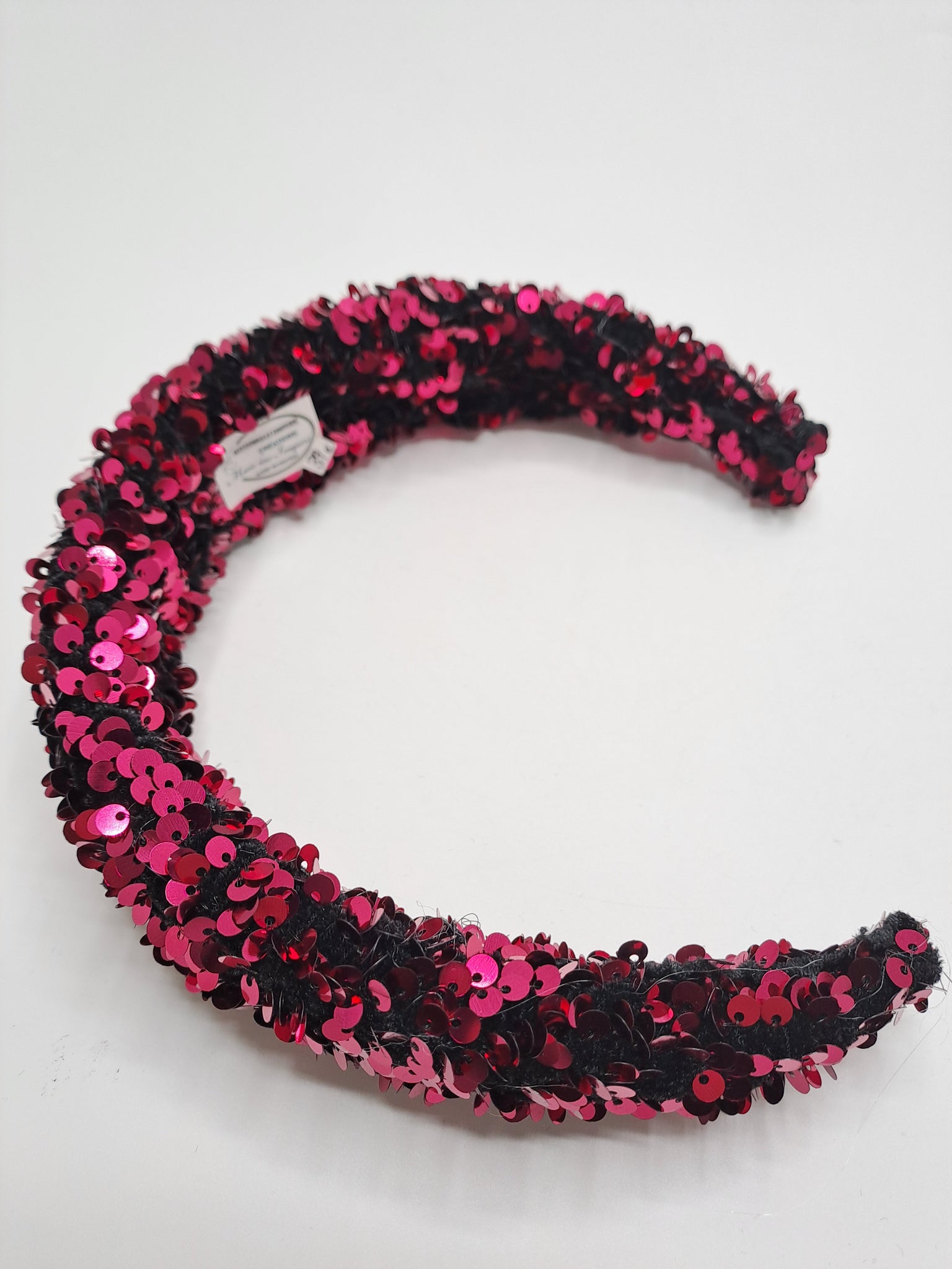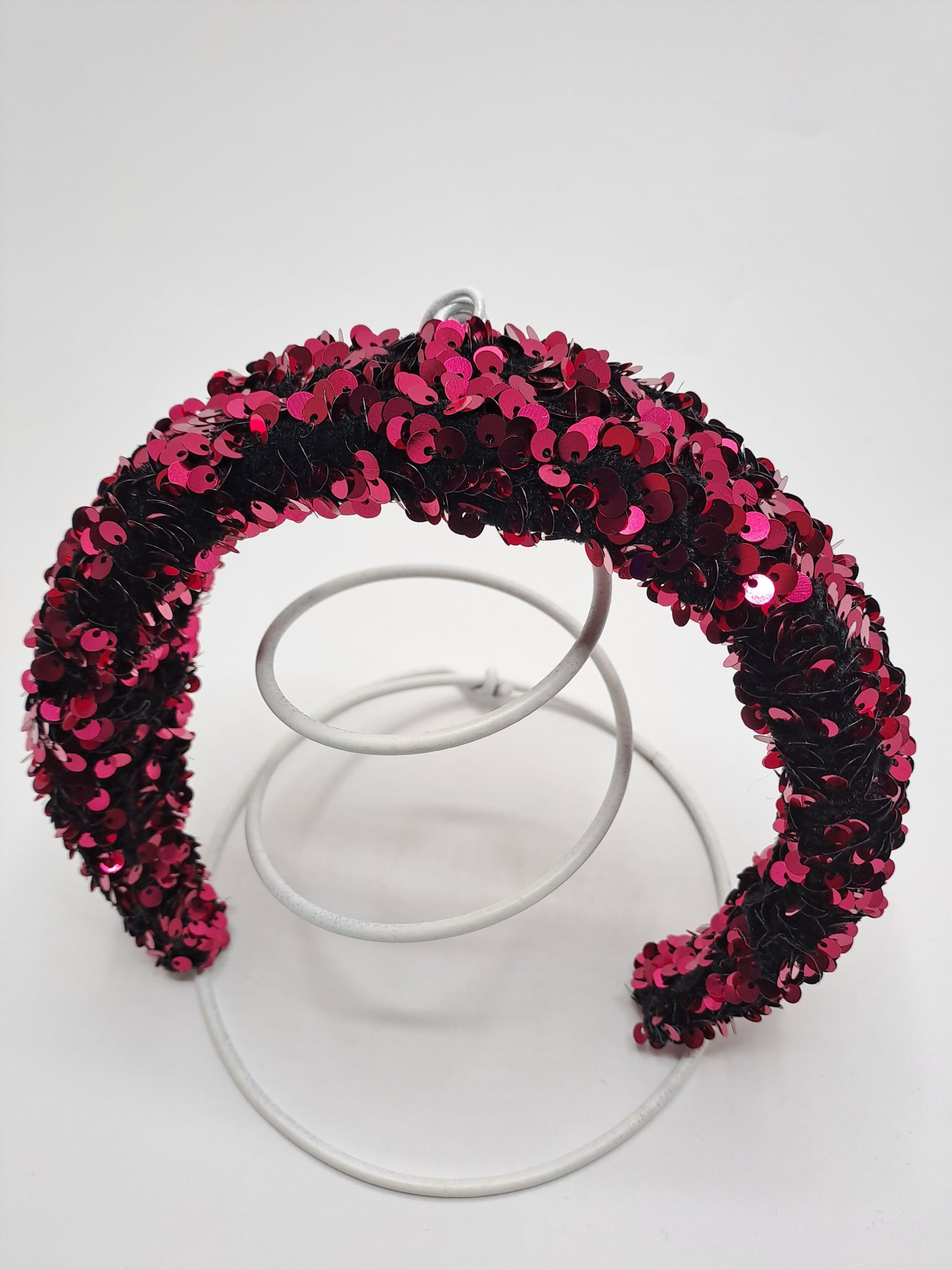 Large serre-tête réalisé en sequins fushia. Serre-tête ajustable à la forme de votre tête. Largeur 4,5cm